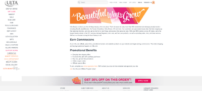 Working with Ulta affiliate program is profitable. First of all, it is absolutely free to register as an affiliate. Two, the commissions given out to affiliates are fair, up to 15%, therefore, there is a high chance for you to make a lot of money as an affiliate marketer for Ulta. As an affiliate, you will enjoy free shipping offers daily, exclusive gifts with qualifying sales, online coupon codes, and many more. Did we mention that the registration process is absolutely free? Register to be an affiliate today!