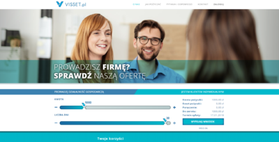 Visset PL - the first loan of up to 500 or 1000 zł for free for individual or company, convenient to determine the installment, the possibility to postpone the repayment of the loan - just submit an application, and after verification process and making a transfer on 1 zł - so you can quickly enjoy the loan on account. VISSET are a financial intermediary of modern solutions in the field of fast online loans. Company has created a safe, simple and legible system that allows you to quickly get cash without leaving your home.