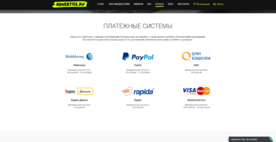 Площадка не устанавливает минимальные лимиты для вывода средств. Выплаты производятся в РУБ и USD. Если рекламодатель проводит оплату целевых действий в другой валюте, Advertise.ru оставляет за собой право конвертировать перевод по актуальному курсу ЦБ России без дополнительного уведомления вебмастеров.