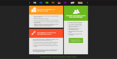 Форматов сотрудничества несколько. Заработать можно на доле от валового дохода с каждого привлеченного клиента (если он стал играть на деньги или положил денежные средства на депозит); на трафике, перенаправляемом на игровые продукты «888»; на гибридной модели (оплата за привлеченного клиента плюс оплата за долю дохода с денежных операций каждого клиента).