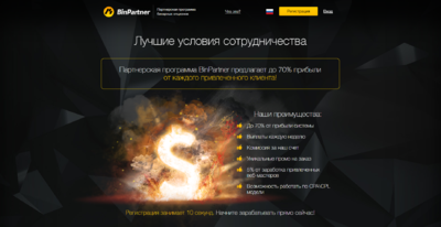 Партнер получает 2% от стоимости опционов клиента (если трейдинг осуществлялся за счет бонусных средств, то 1%) и комиссию, которая зависит от дохода рекламодателя и депозита клиента.
