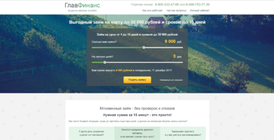 Микрокредитная компания "ГлавФинанс" присутствует на рынке с 2012 года. Микрофинансовая компания Главфинанс предлагает быстрые займы онлайн - срочно, без проверок и без отказа. У нас легко взять кредитный заем на карту и быстро получить деньги. Мы принимаем онлайн заявки круглосуточно.Компания предлагает онлайн микрозайм до 30 тыс. рублей на две недели.
