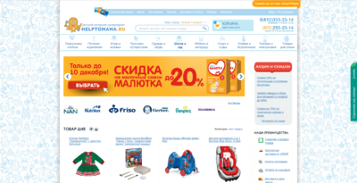 Helptomama.ru – это интернет-магазин товаров для детей. На сайте магазина представлено более 10 000 товарных позиций наиболее известных и популярных мировых брендов в различных категориях: детское питание, в том числе и специализированное, а также безглютеновое, подгузники и гигиена, одежда, мебель, коляски, игрушки, товары для мам и многое другое.