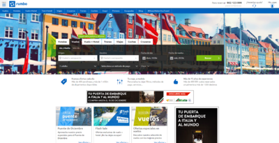 Появившийся в 2000 году, Rumbo занимается коммерцией билетов во всех авиакомпаниях (включая недорогие авиакомпании), гостиницы со всего мира, билеты на поезд, динамичные и туристические пакеты отдыха, круизы и прокат автомобилей.