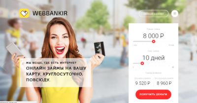 ООО МФК «ВЭББАНКИР» - система моментального электронного кредитования - предоставляет онлайн микрозаймы «под ключ», начиная с рассмотрения заявки до получения клиентом денежных средств. Клиенты получают займы без посещения офиса. "Вэббанкир" - выгодная альтернатива банковскому кредитованию - получить займ онлайн можно в течение 24 часов. Срочный займ в день обращения и без поручителей за 5 минут. Это важно для клиентов, желающих получить займ на месяц и быстро воспользоваться деньгами.