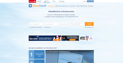 Chocotravel.com – туристический портал, созданный для казахстанцев! Начиная с 2013 года, портал старается сделать все возможное, чтобы Вы могли путешествовать дешевле! На сайте Вы можете найти, забронировать и купить авиабилеты онлайн практически на любую авиакомпанию в мире. Вы сможете найти билет на любое направление по минимальной цене. Покупайте авиабилеты и участвуйте в бонусной программе. Получайте 5000 бонусов за первую покупку билетов, по 1% за каждую последующую покупку и экономьте на следующих путешествиях! Также Вы можете забронировать отели от всемирного гостиничного портала Booking.com на сайте и получить 3% на Ваш бонусный счет. Если же Вы ищете альтернативу авиаперелетам, то можете приобрести железнодорожные билеты онлайн без очереди и не выходя из дома! Покупая ж/д билеты на Chocotravel, Вы сможете насладиться рядом преимуществ и сократить свое время на поиск подходящего по времени и цене билета на поезд. Ежемесячно сайт посещают сотни тысяч путешественников и тысячи из них приобретают билеты!