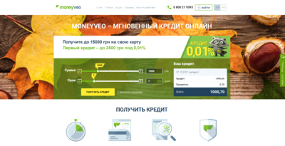 • Moneyveo.ua предоставляет займы до 8 000 грн (до 2 500 грн при первом обращении) сроком до 30 дней. Все что нужно, для того, чтобы получить кредит - это банковская карта и доступ к сети интернет.