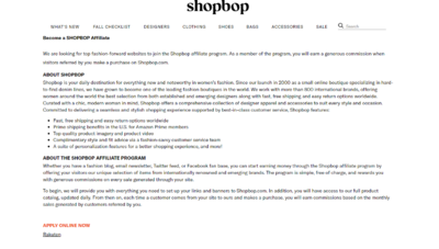 У Shopbop есть активная партнерская программа для аффилиатов, продвигающих Shopbop. Если вы владелец веб-сайта, который пользуется популярностью у женщин, и каждый месяц он получает значительное количество трафика, вы можете монетизировать свою веб-страницу, поощряясь Shopbop. И за каждую продажу вы получите комиссию в размере до 8%! Это щедрое предложение, учитывая, что все, что вам нужно сделать, - это привлечь трафик в свой магазин, чтобы продвигать свои продажи.