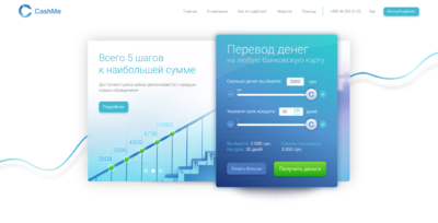 CashMe — онлайн сервис быстрой финансовой помощи жителям Украины, позволяющий в течение нескольких минут получить кредит на свою банковскую карту. Количество людей, которые уже оценили скорость и удобство получения мгновенных онлайн займов от CashMe, растет ежедневно. Основой работы CashMe является гибкость и прозрачность условий, что позволяет не только предоставлять каждому клиенту индивидуальную программу кредитования, но и улучшать качество жизни.