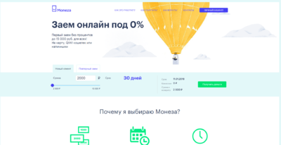 Монеза – это сервис онлайн-займов, позволяющий получить до 30 000 рублей на срок до 60 дней с ежемесячным погашением. При этом сумма и срок могут быть и меньше – они зависят от Ваших потребностей. Мы обрабатываем Вашу заявку несколько минут, и после этого Вы получаете деньги способом, удобным именно Вам.